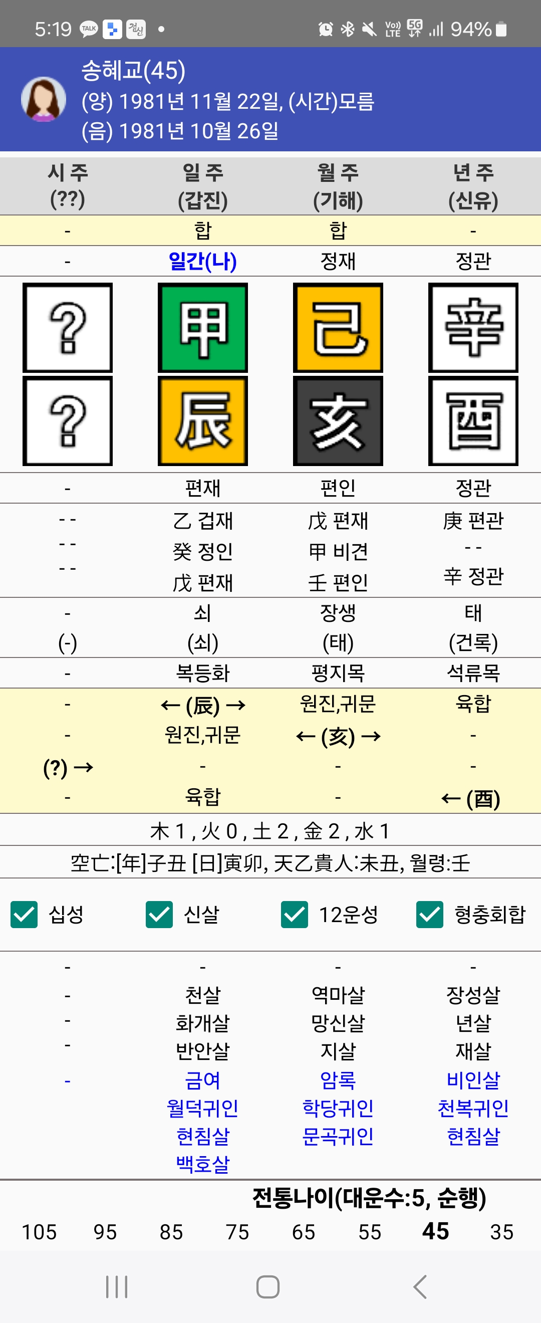 송혜교님 사주는 해월에 갑진일주이다. 신약한 사주 처럼 보이지만 일주갑목이 진토에 뿌리를 내리고 갑진일주가 백호기운을 가지고 있고 해월에 갑목이 있어 강한 사주라고 보여집니다.