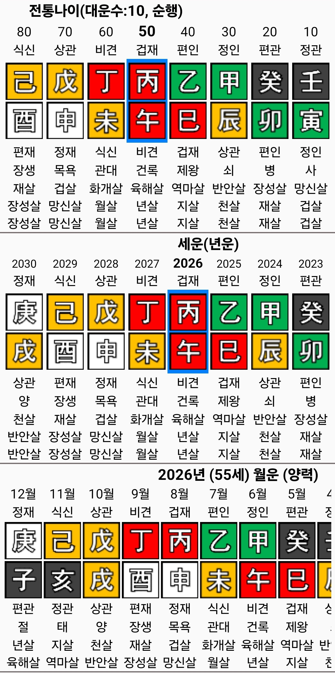 매우 신약사주이지만 정유일주는 촛불에 기름 단지를 깔고 있는 형상으로 정신력이 매우 강하고 신약사주에서 인비운인 木, 火운 들어와야 한다. 운의 흐름이 60대운까지 火로 흐르게 되니 더욱 많은 부를 이루게 된다.